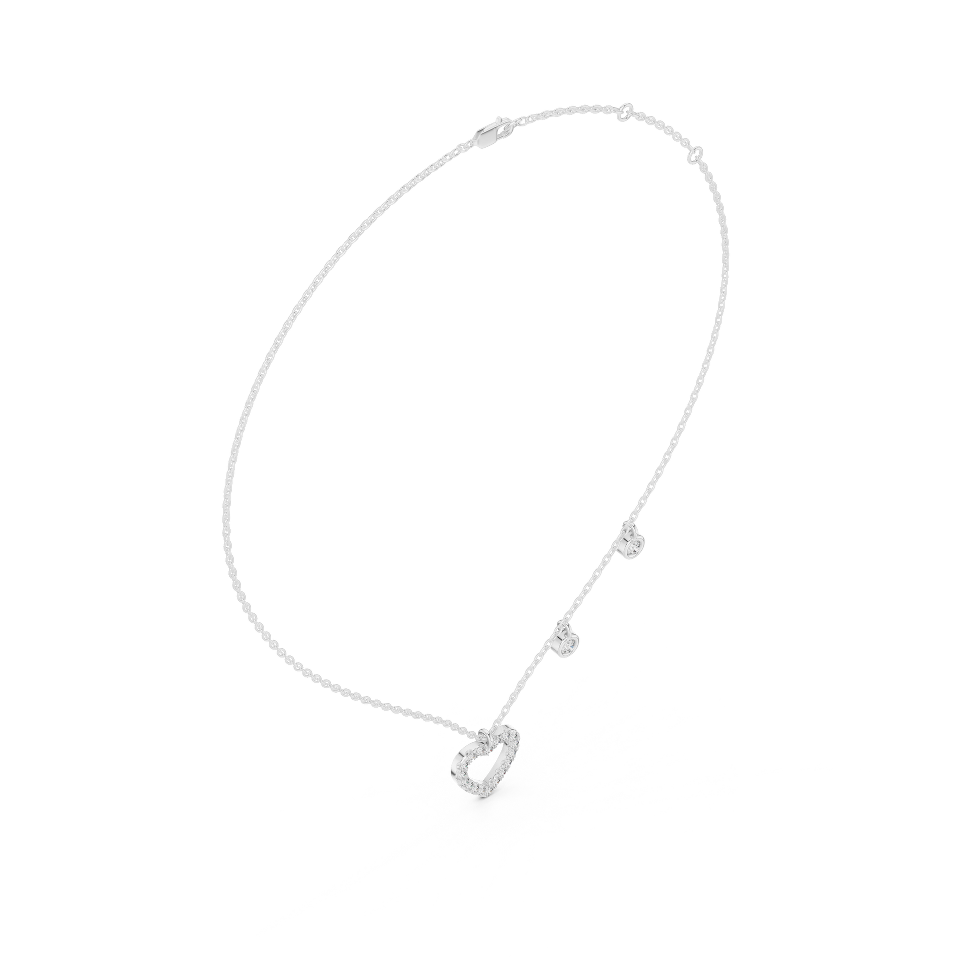 Delicate yet dazzling, this heart-shaped pendant necklace radiates feminine charm. Crafted in your choice of yellow gold, rose gold, platinum, or 925 silver, it features a heart-shaped outline encrusted with sparkling diamonds, accompanied by two bezel-set diamond charms that dance along the chain.