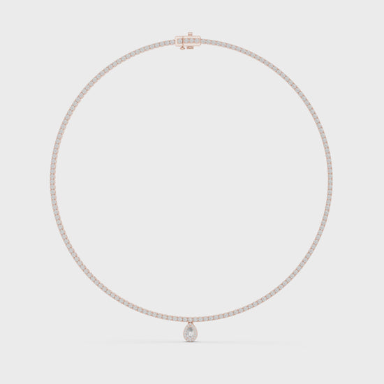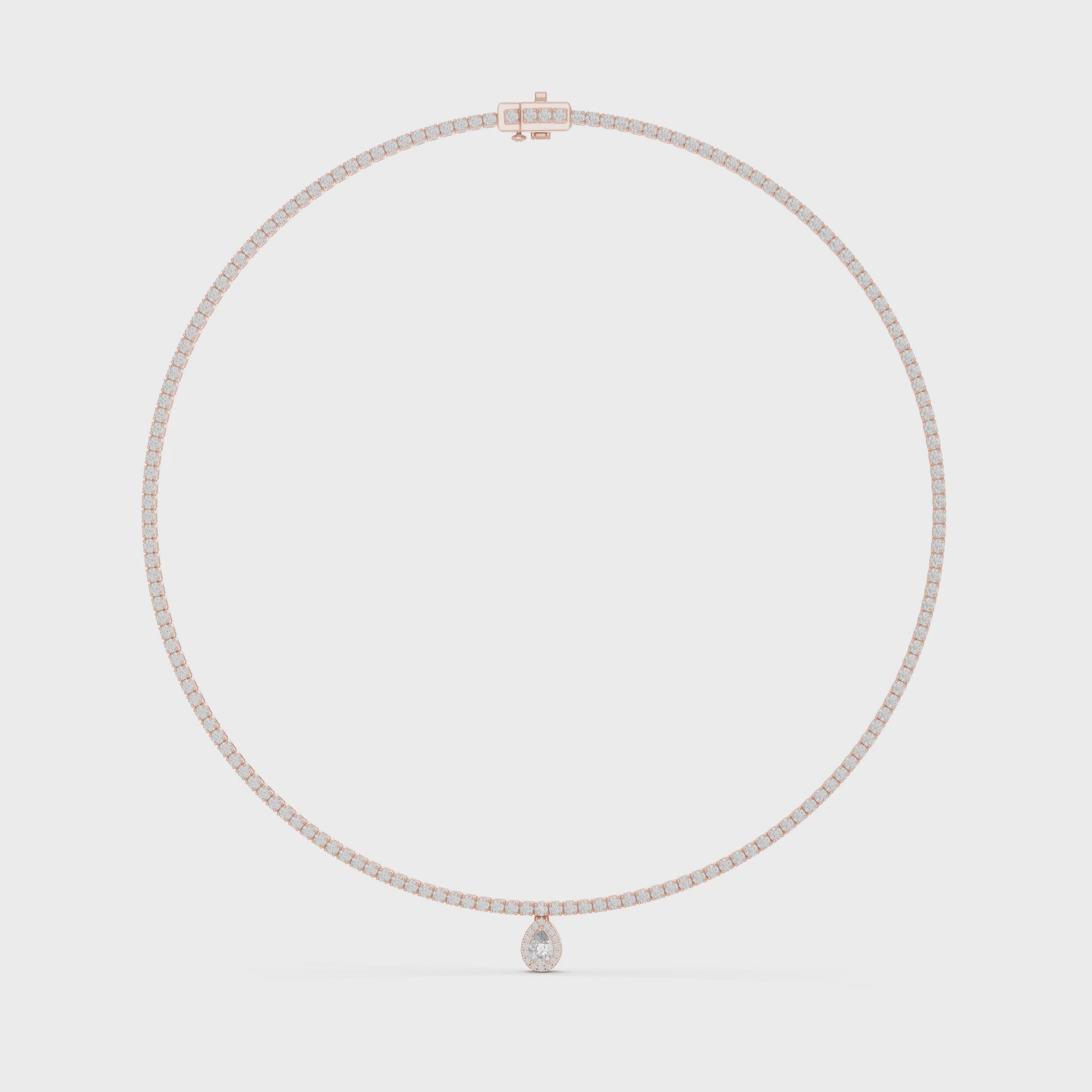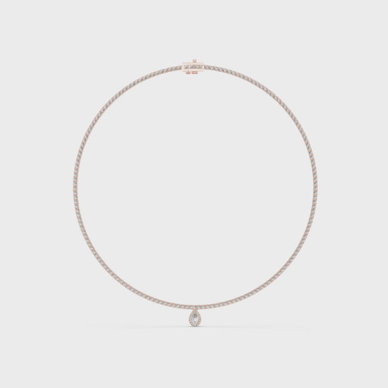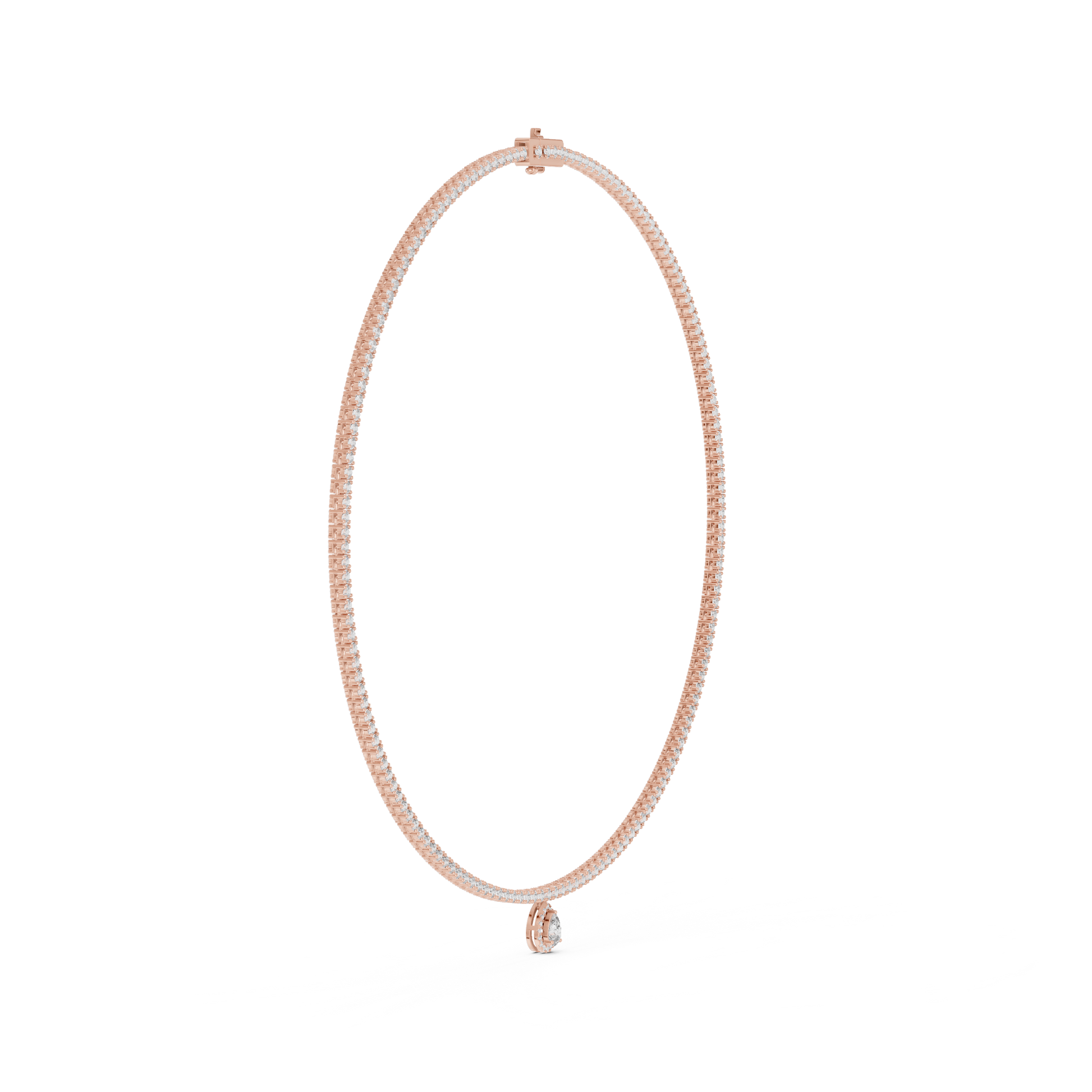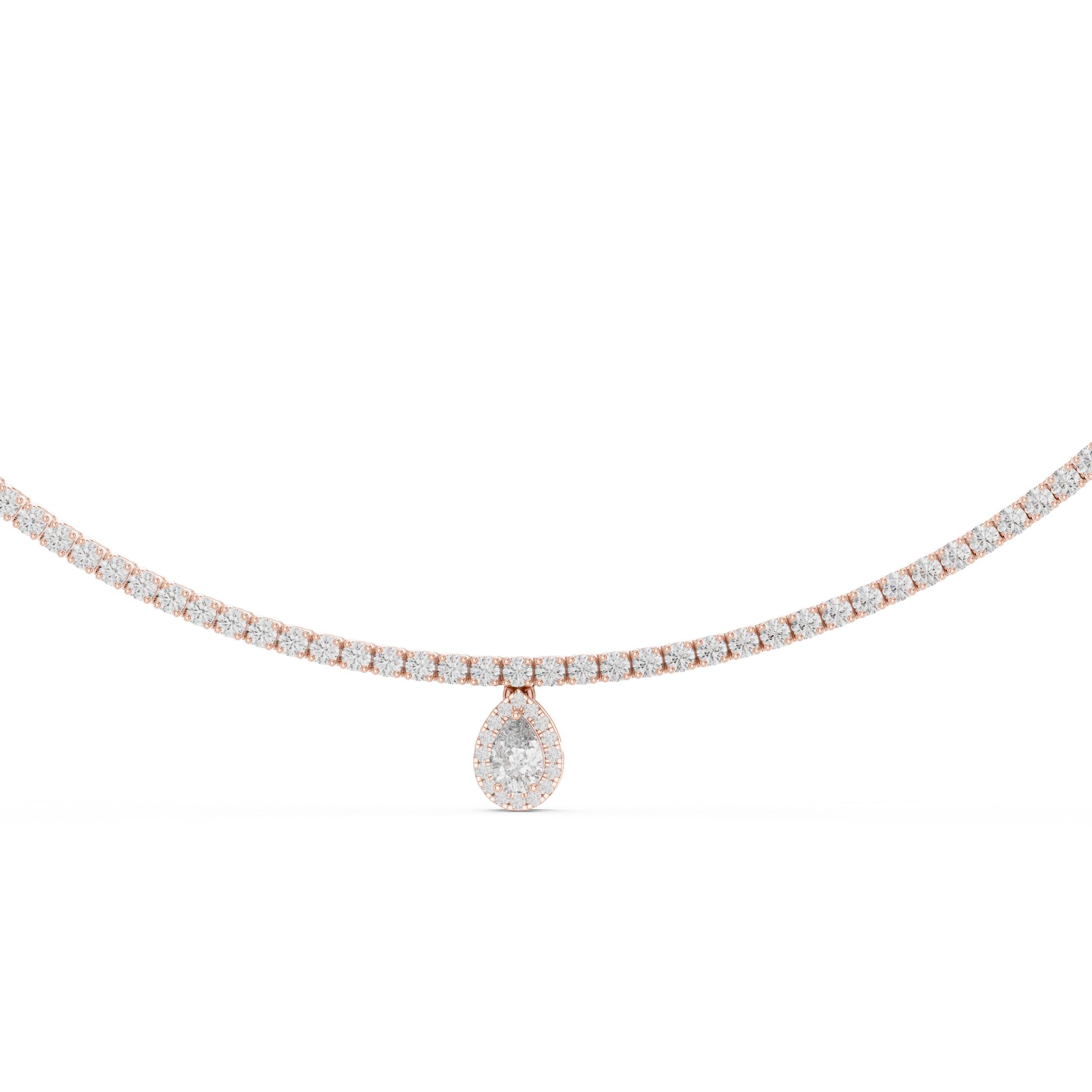 Elegance in every detail—this double-line diamond necklace is a masterpiece of craftsmanship and luxury. Meticulously crafted in radiant rose gold (also available in yellow gold, platinum, and 925 silver), it features two rows of sparkling round-cut diamonds that gracefully curve along the neckline. A stunning pear-shaped drop pendant adds a dramatic and feminine touch to this sophisticated piece.