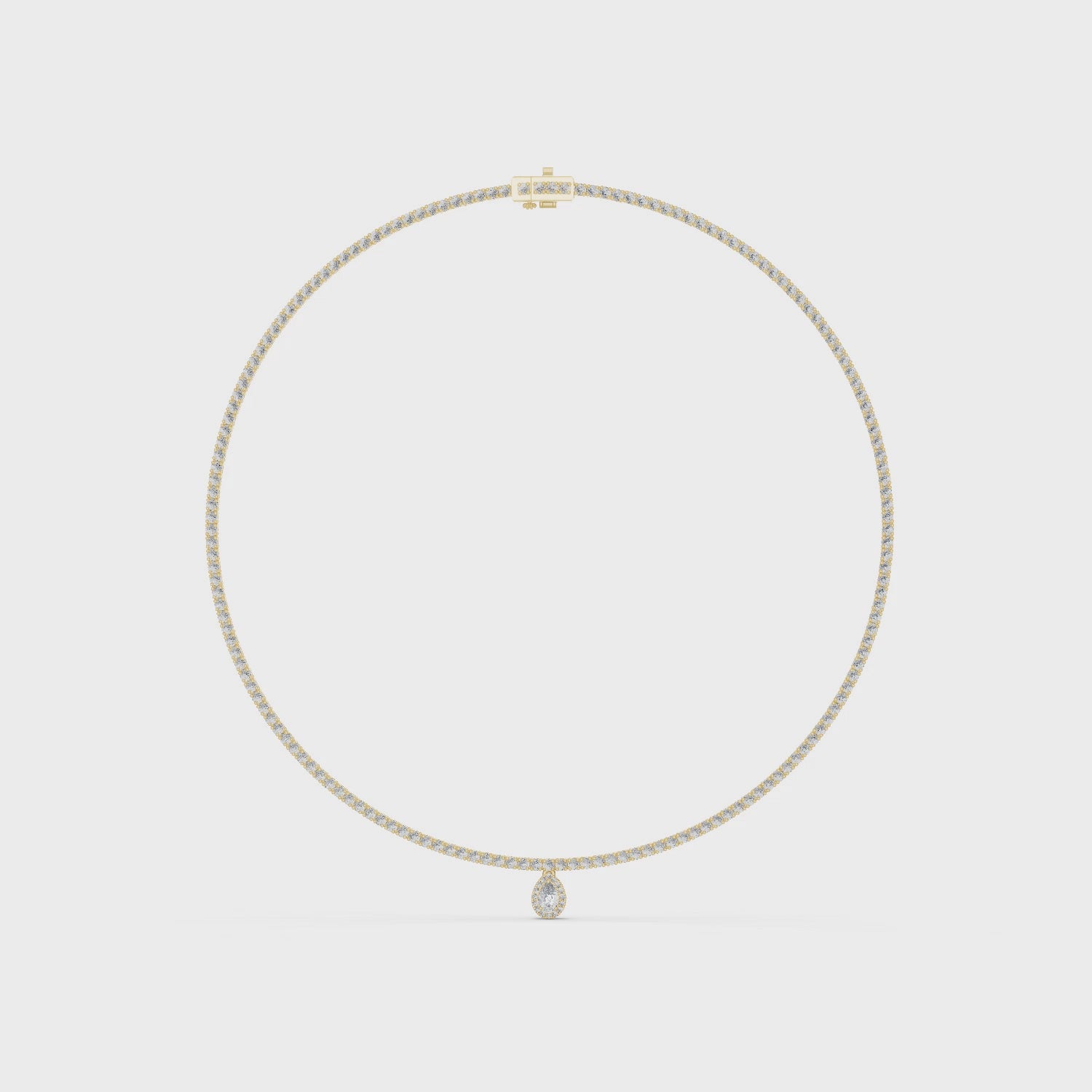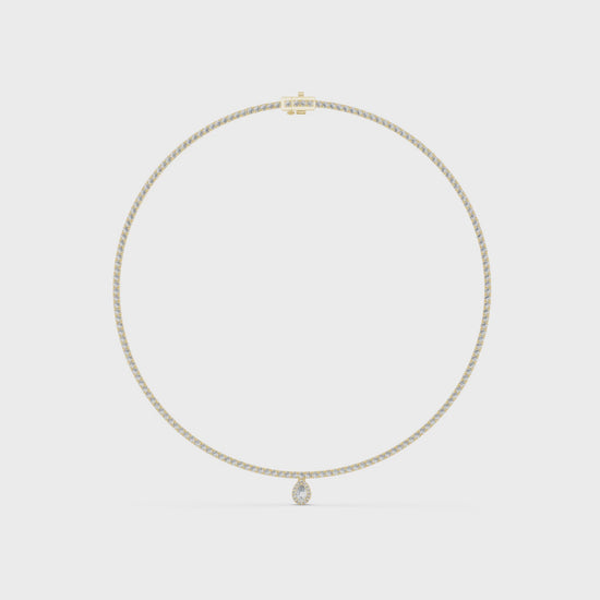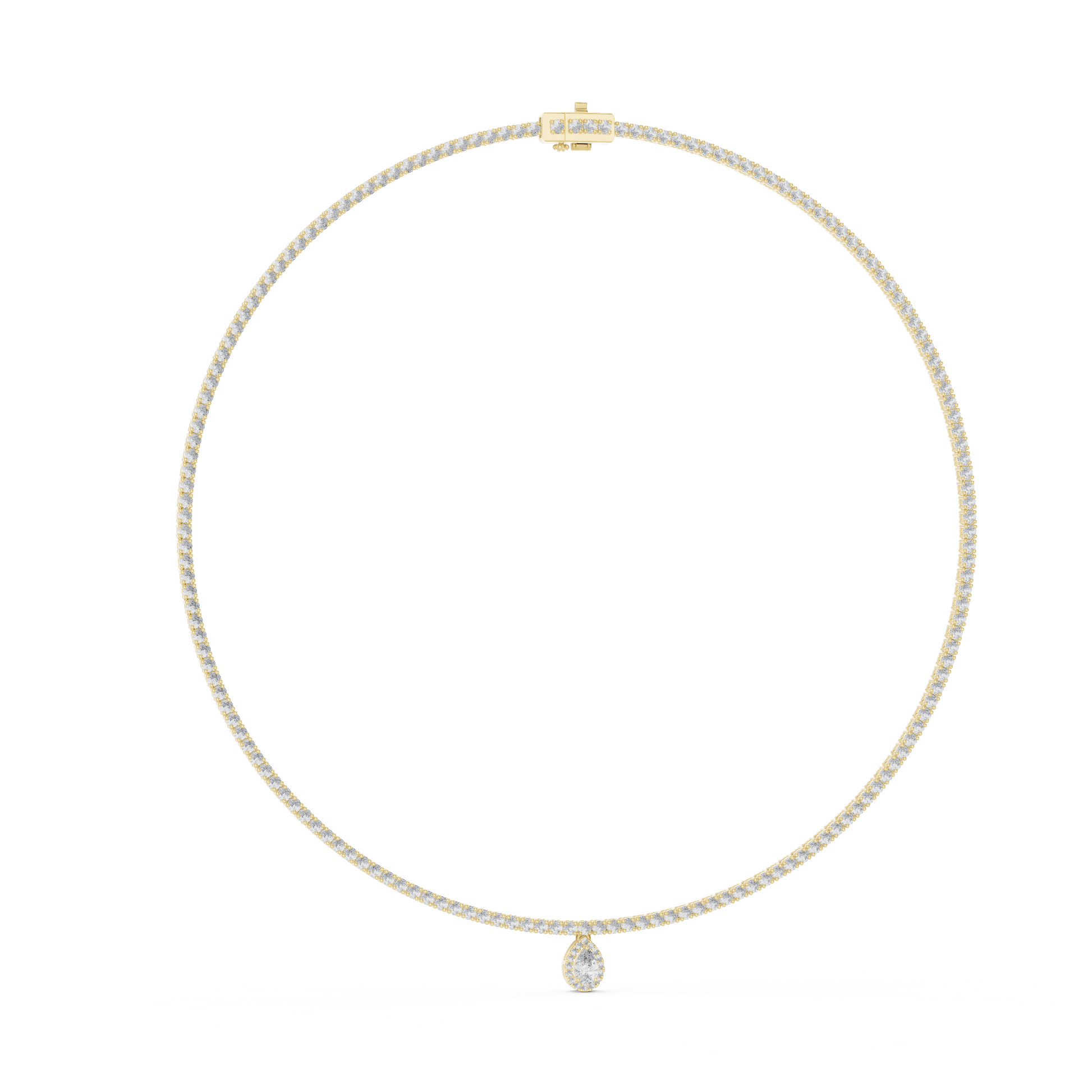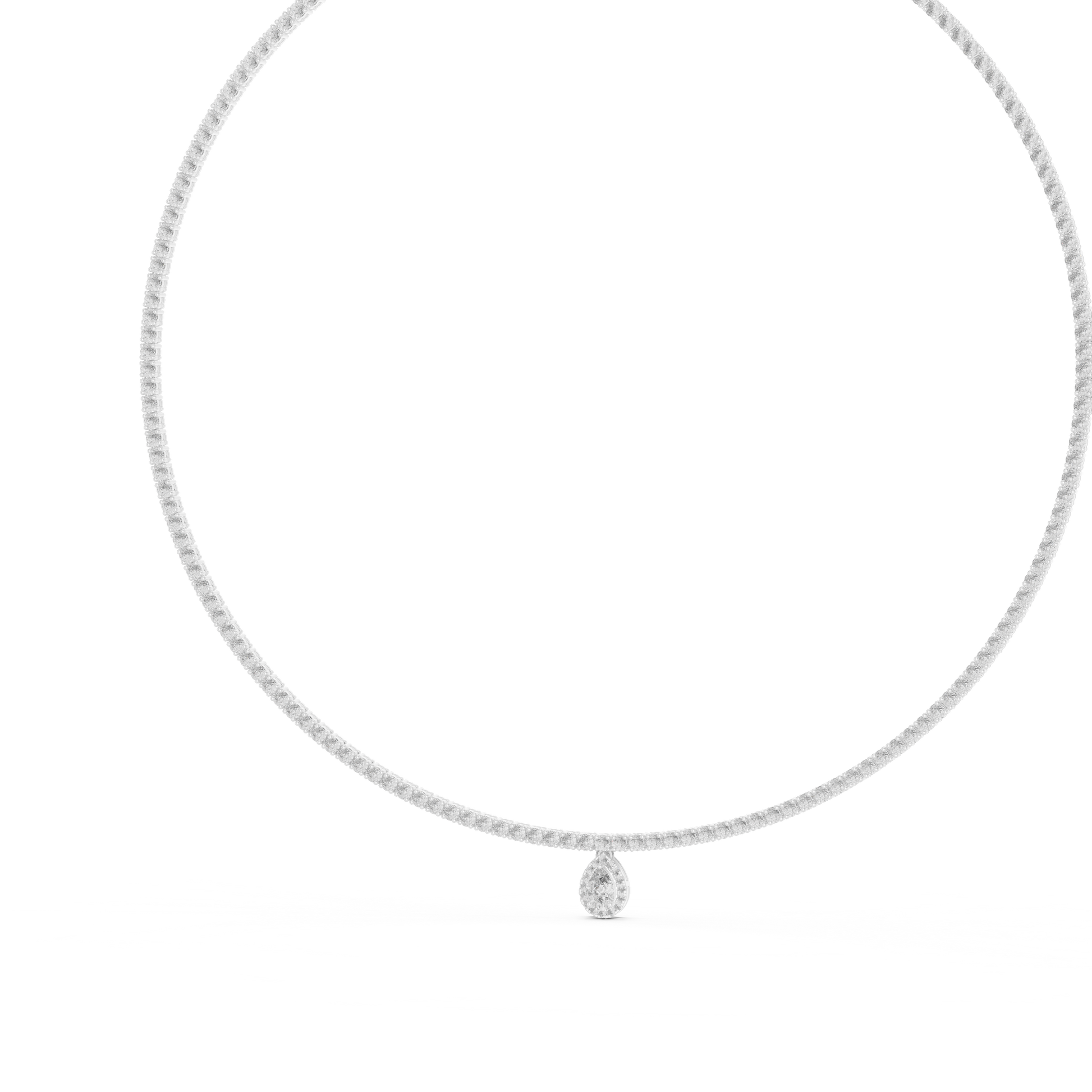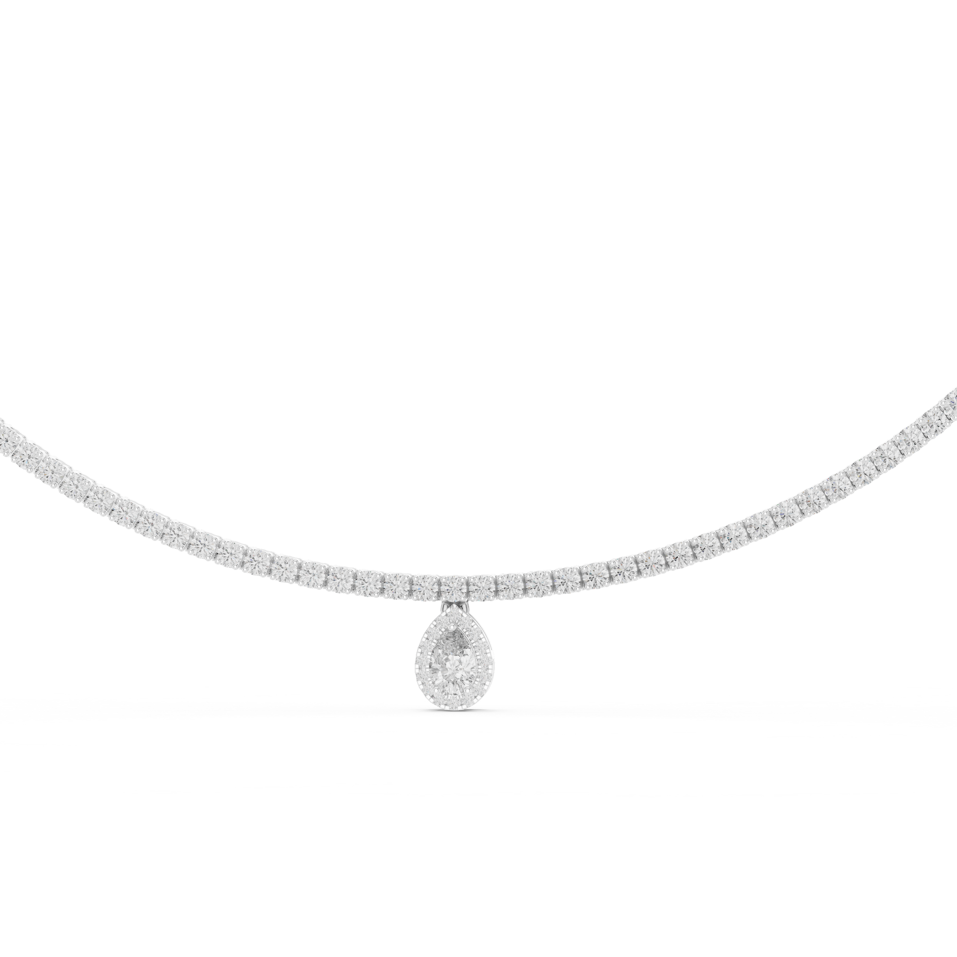 Elegance in every detail—this double-line diamond necklace is a masterpiece of craftsmanship and luxury. Meticulously crafted in radiant rose gold (also available in yellow gold, platinum, and 925 silver), it features two rows of sparkling round-cut diamonds that gracefully curve along the neckline. A stunning pear-shaped drop pendant adds a dramatic and feminine touch to this sophisticated piece.