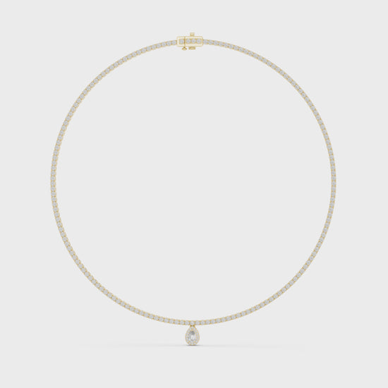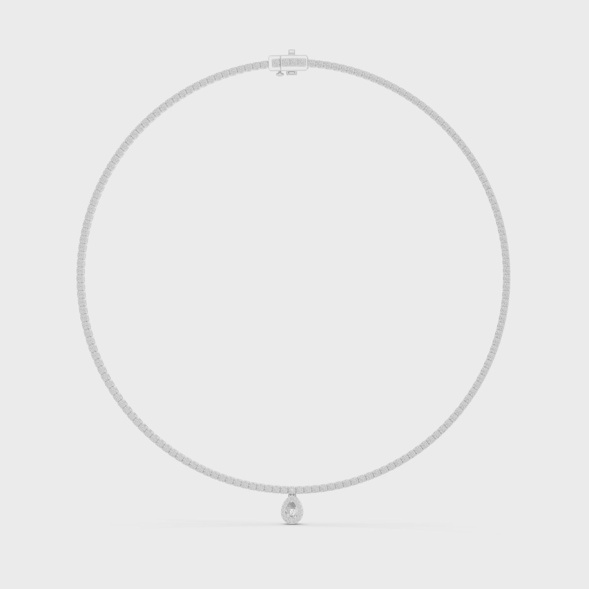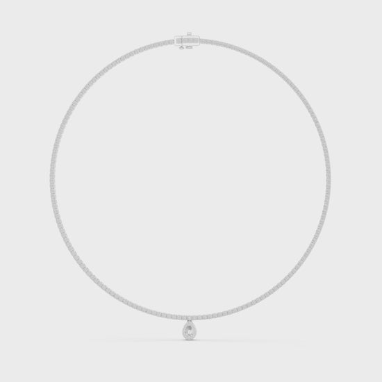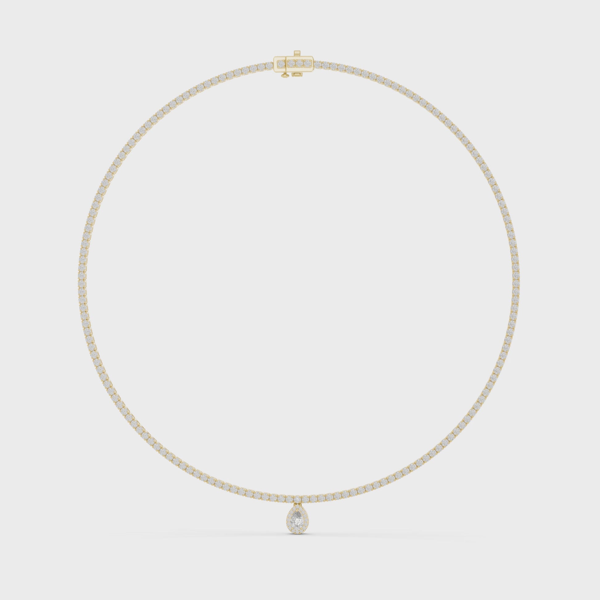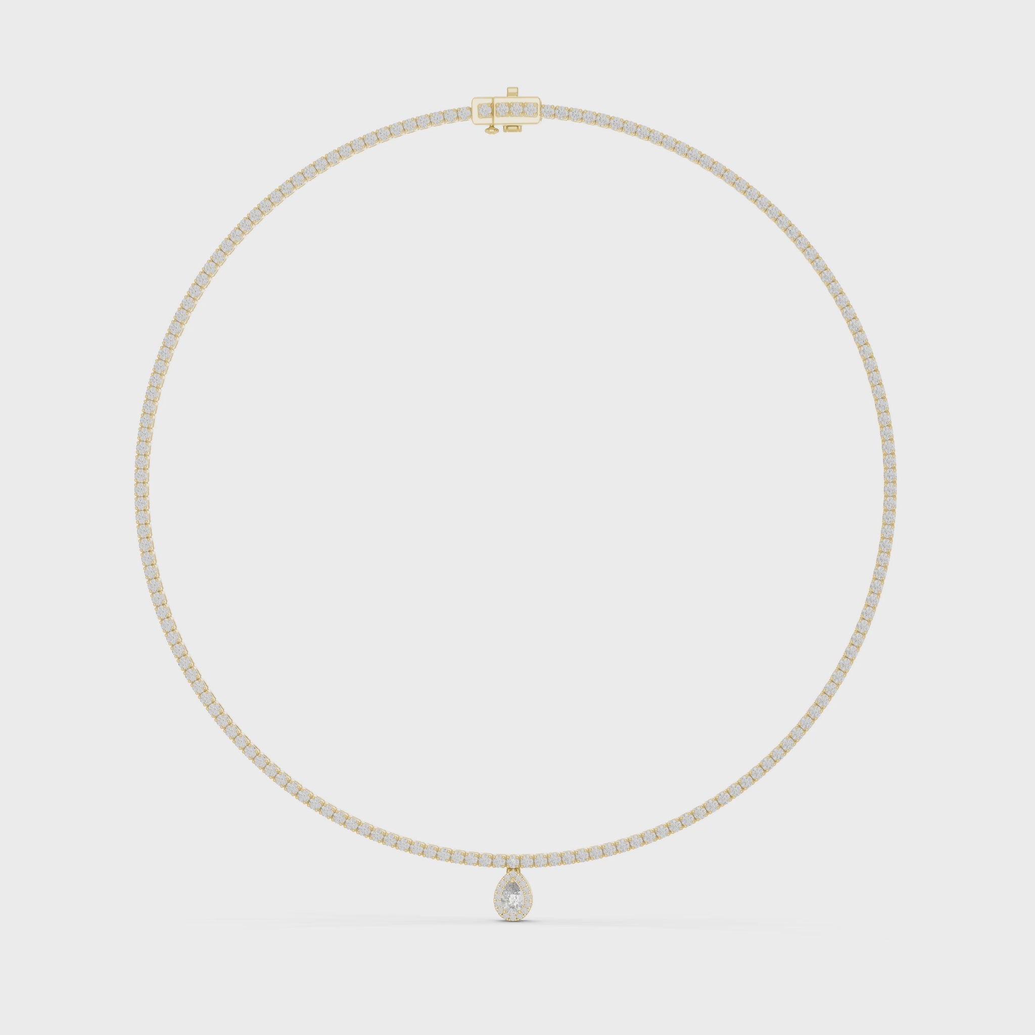 Elegance in every detail—this double-line diamond necklace is a masterpiece of craftsmanship and luxury. Meticulously crafted in radiant rose gold (also available in yellow gold, platinum, and 925 silver), it features two rows of sparkling round-cut diamonds that gracefully curve along the neckline. A stunning pear-shaped drop pendant adds a dramatic and feminine touch to this sophisticated piece.