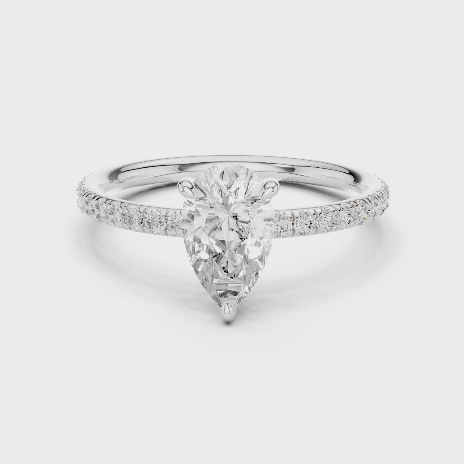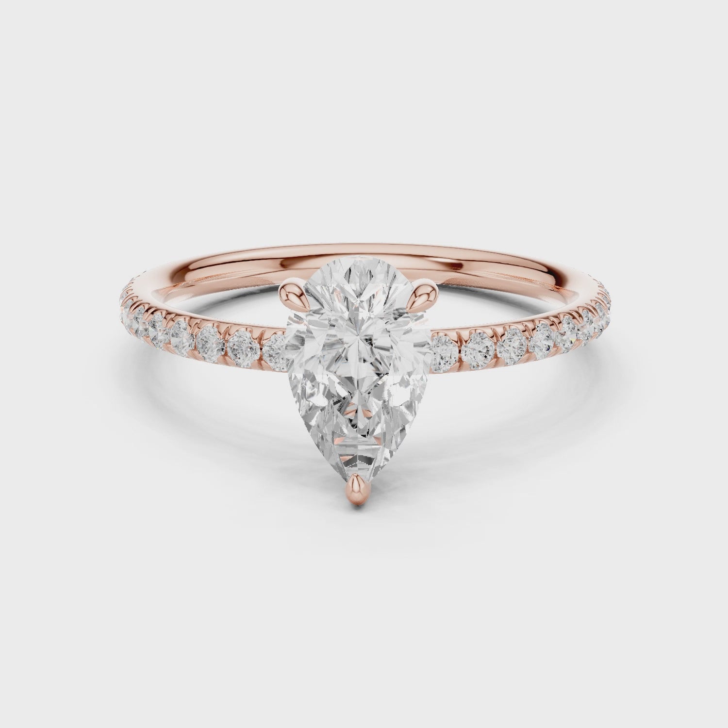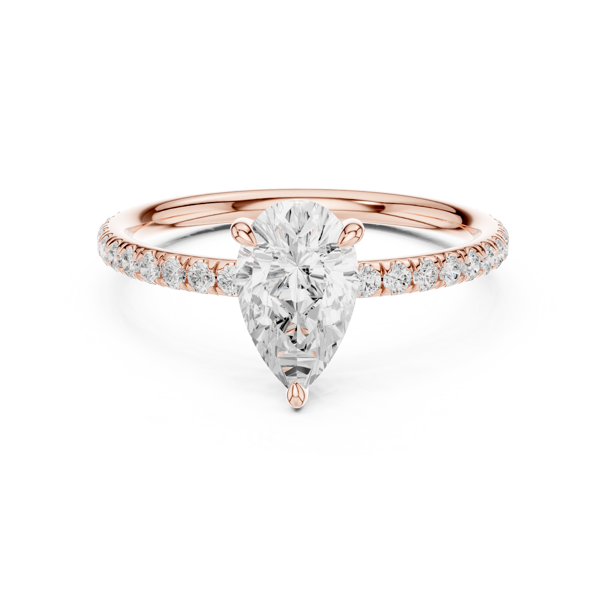 Sculpted with grace and precision, this pear-cut solitaire diamond ring is a celebration of elegance and individuality. The teardrop-shaped center stone, cradled in a rose gold band (also available in yellow gold, platinum, and 925 silver), elongates the finger with brilliance and charm. Pavé-set accent stones along the band add extra sparkle without overpowering its delicate balance.