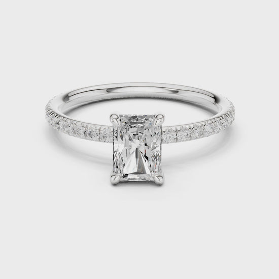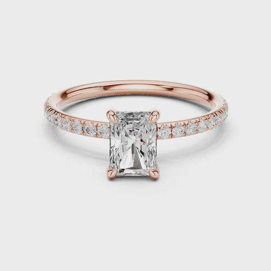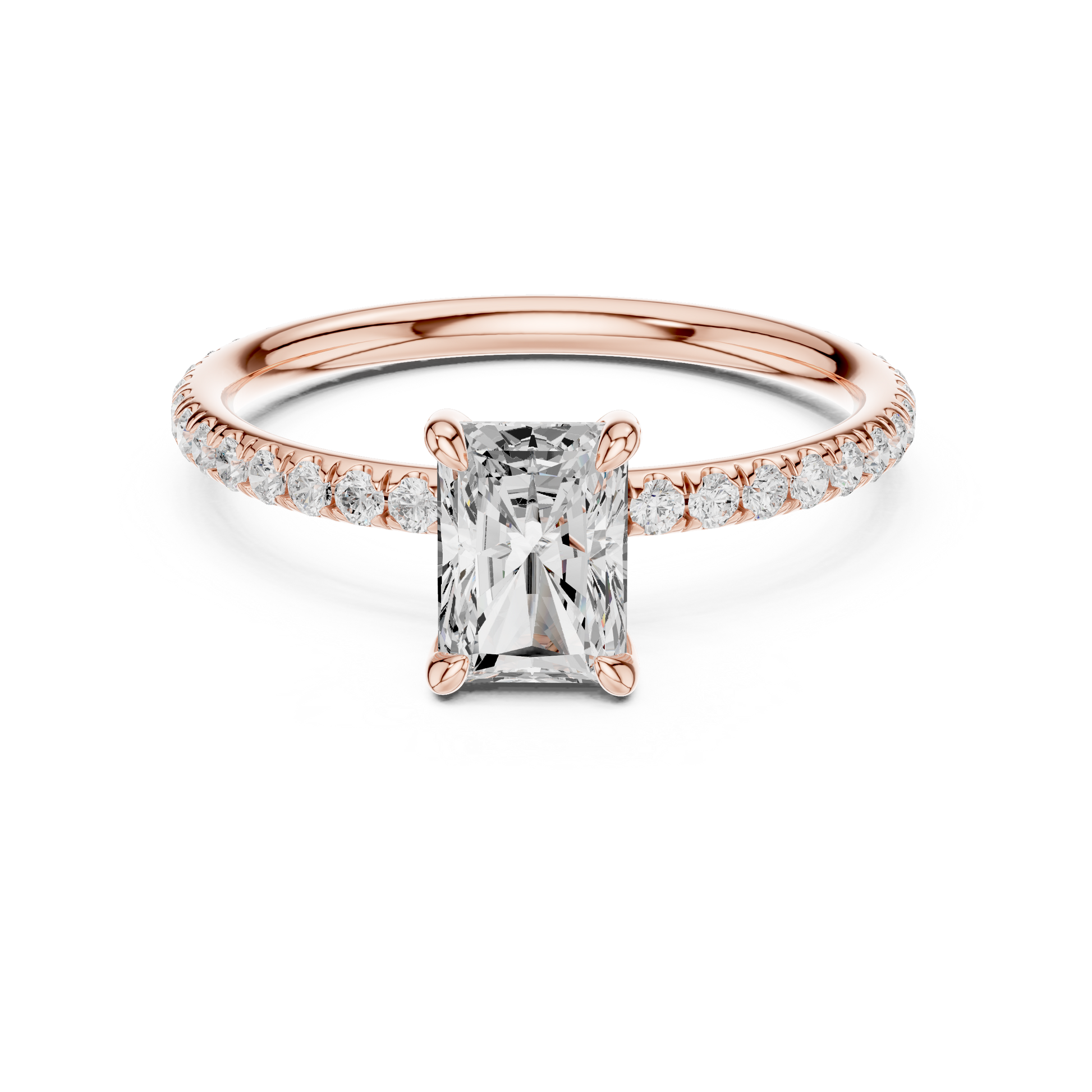 Bold brilliance meets timeless charm in this radiant-cut solitaire diamond ring. A dazzling centerpiece, the radiant-cut diamond is expertly set in four sleek prongs atop a shimmering rose gold pavé band. Meticulously crafted to enhance sparkle from every angle, this ring is available in Yellow Gold, Rose Gold, Platinum, and 925 Silver.