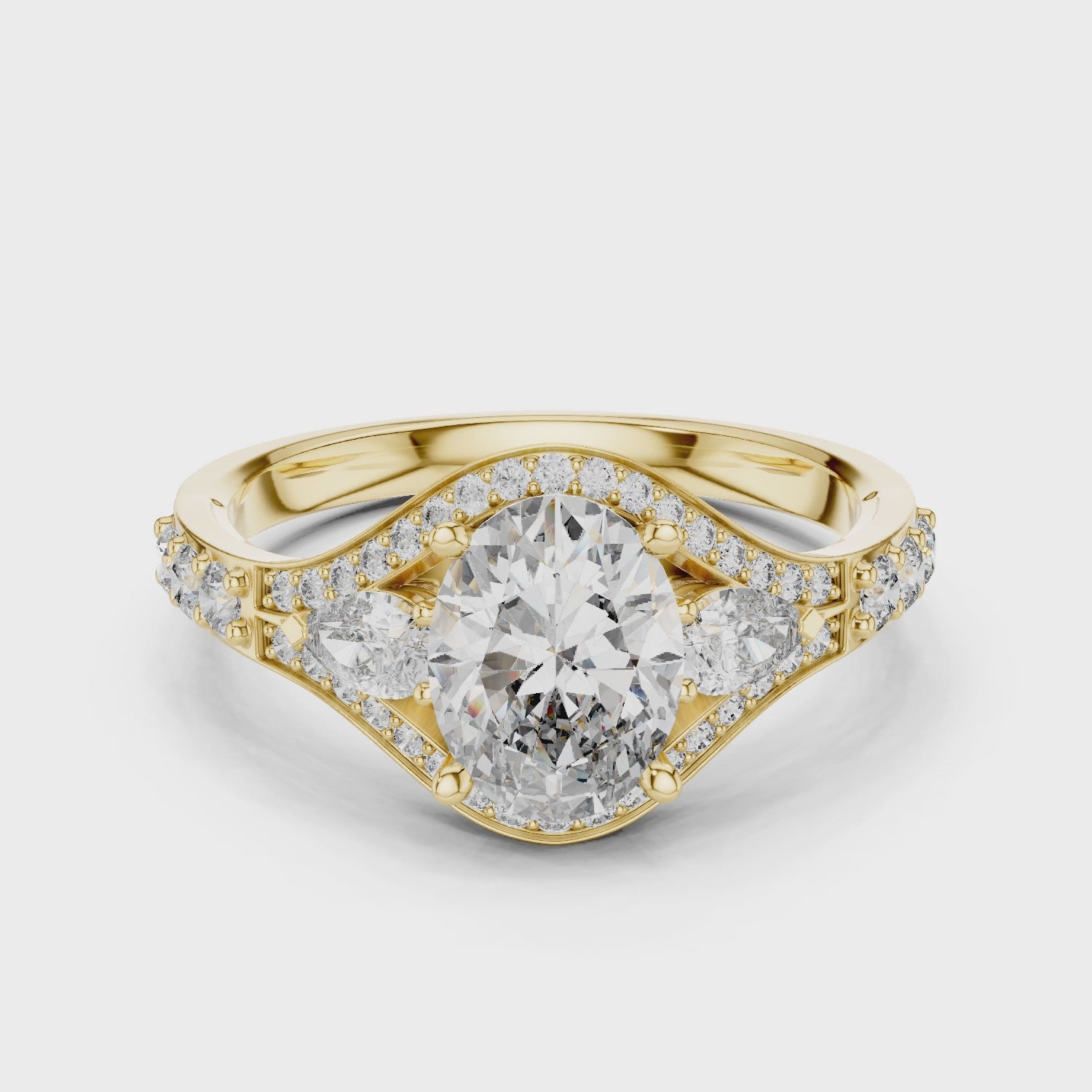 Elevate your elegance with our Three-Stone Oval Solitaire Diamond Ring, a timeless masterpiece designed for women who love bold brilliance. Featuring a magnificent oval-cut center diamond, flanked by two round side stones and a halo of sparkling diamonds, this ring exudes unmatched luxury.