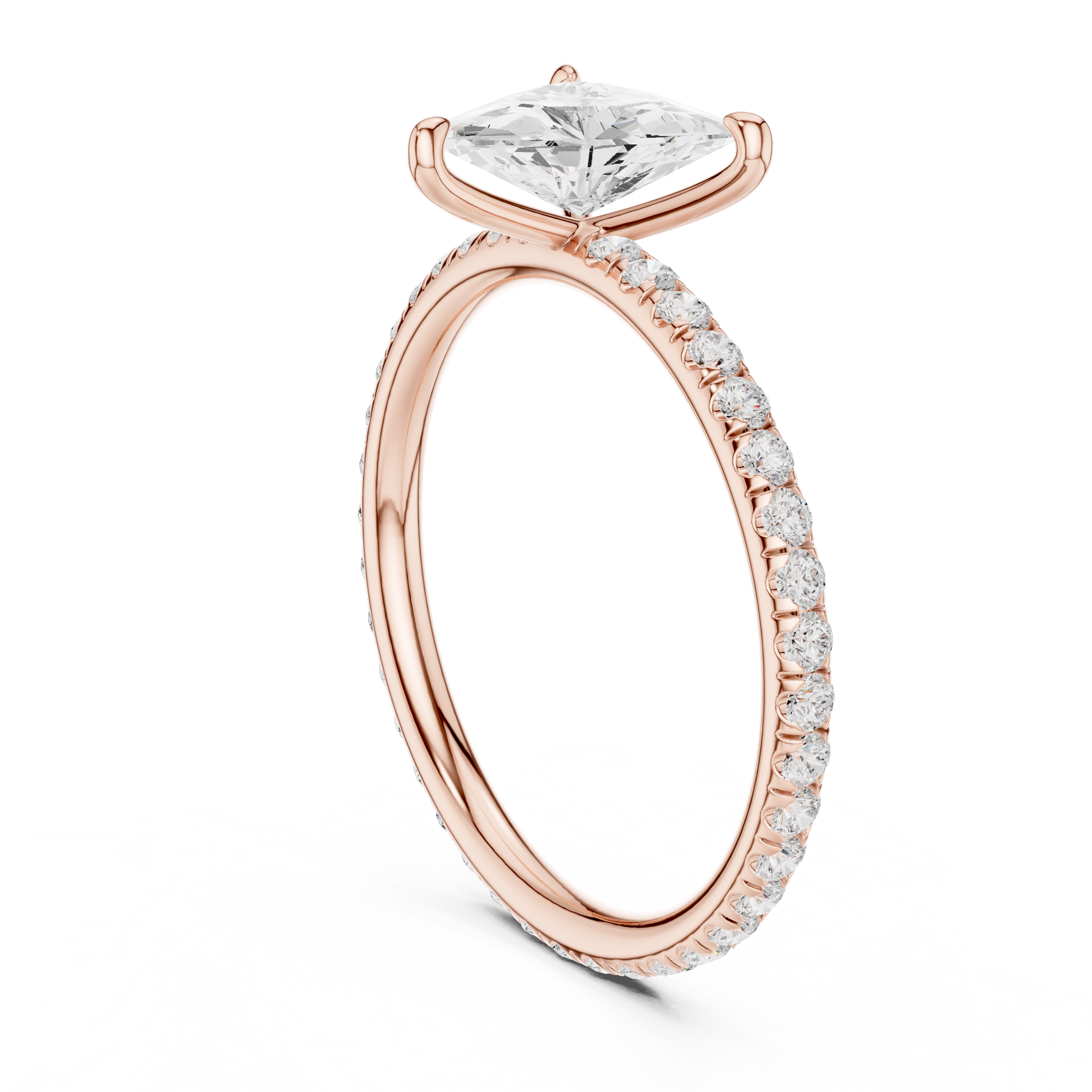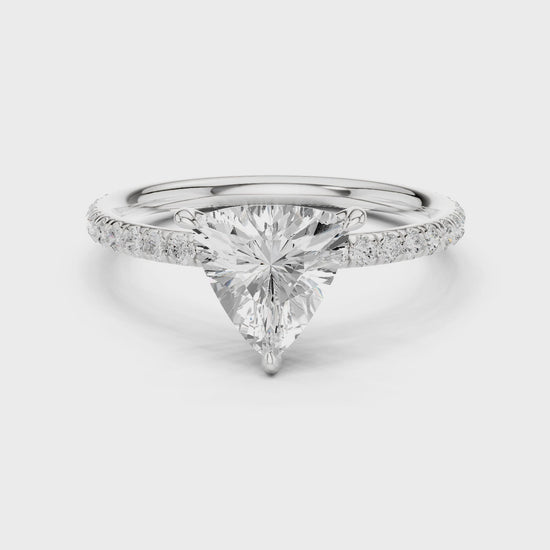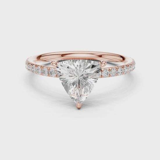 Sleek, modern, and full of edge, this triangle-cut diamond ring is a bold statement of contemporary elegance. The striking triangular center stone is framed by a pavé-set diamond band that brings extra brilliance and contrast. Set in warm rose gold and available in Yellow Gold, Platinum, and 925 Silver, this ring is designed for those who love to stand out.